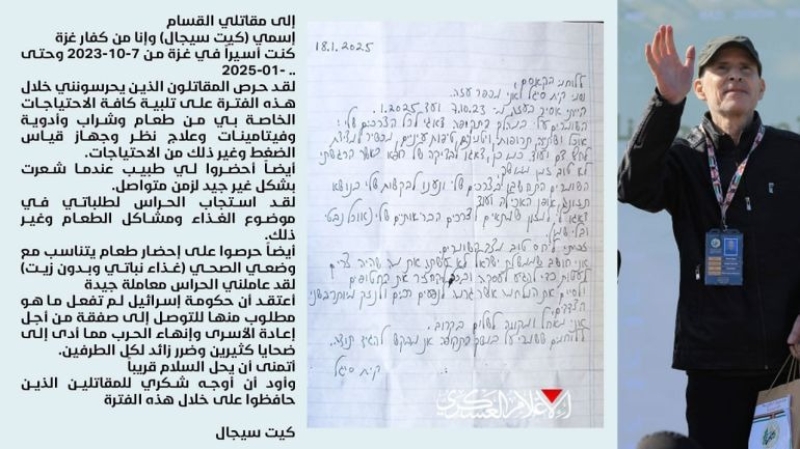 ووفقا للرسالة التي نشرتها القسام مع ترجمتها العربية عبر تليغرام اليوم الأحد، قال سيغال (65 عاما) إن مقاتلي القسام الذين تولوا حراسته طوال مدة احتجازه حرصوا على تلبية كل احتياجاته من طعام وشراب وأدوية وفيتامينات.