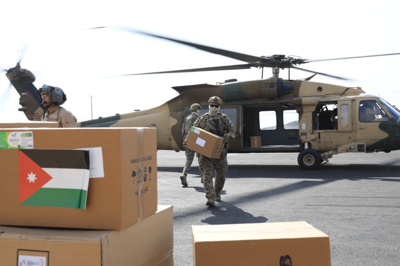 واعلنت القوات المسلحة ارسال 16 طائرة مروحية على متنها 20 طناً من المساعدات ، بالتعاون مع الهيئة الخيرية الأردنية الهاشمية وعدد من الدول الشقيقة والصديقة.