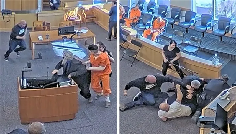 وهرع ضابط إصلاحي للمساعدة بينما كان المحامون والمتهمون الآخرون وأفراد الجمهور يشاهدون، مذهولين، قبل أن يفض رجال إنفاذ القانون المشاجرة في النهاية.