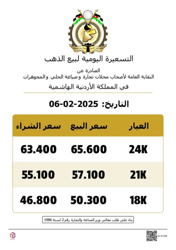 فيما بلغ سعر بيع غرام الذهب عيار 24 65.60 دينار ، وللبيع 63.40 دينار.