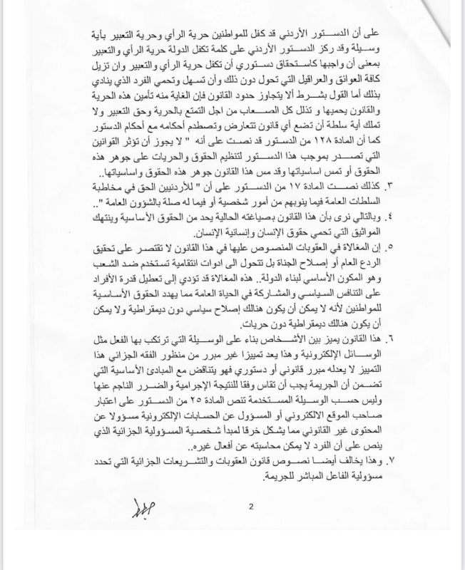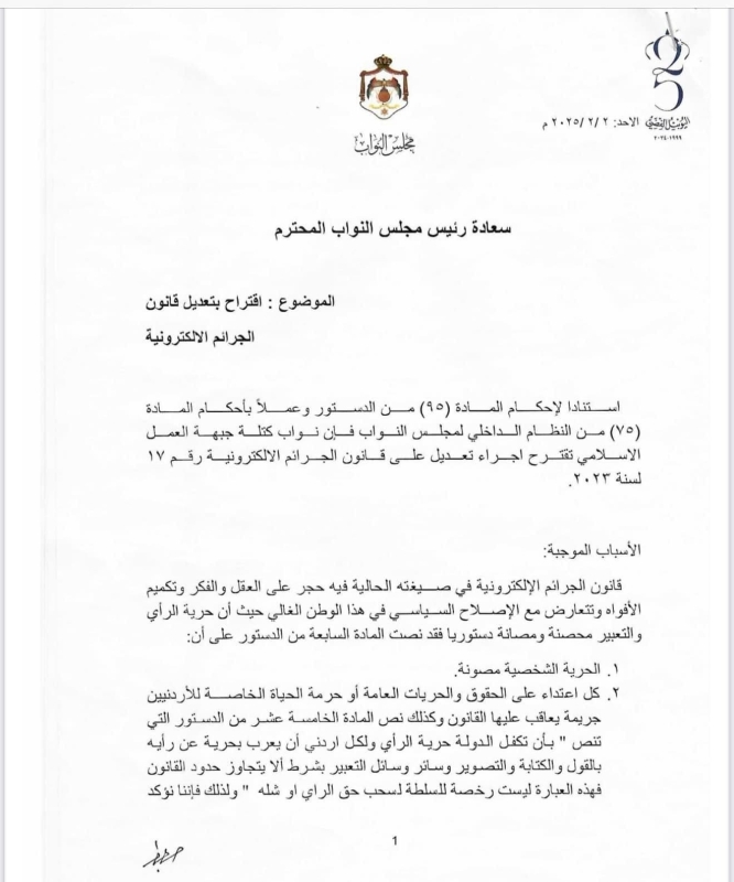 وبحسب ما أعلنته النائبة ديمة طهبوب، تقدمت كتلة نواب جبهة العمل الإسلامي إلى مجلس النواب بمشروع قانون يمنع تهجير الفلسطينيين إلى الأردن، ومشروع آخر لتعديل قانون الجرائم الإلكترونية.