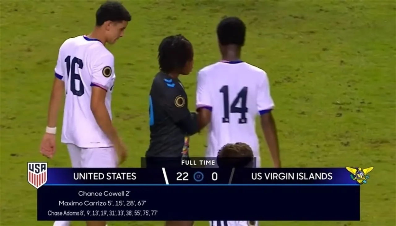 واكتسحت الولايات المتحدة منتخب جزر فيرجن أيلاندز الأمريكية بنتيجة 22-0، فجر الثلاثاء، فيما أحرز تشيس آدامز 10 أهداف في اللقاء.