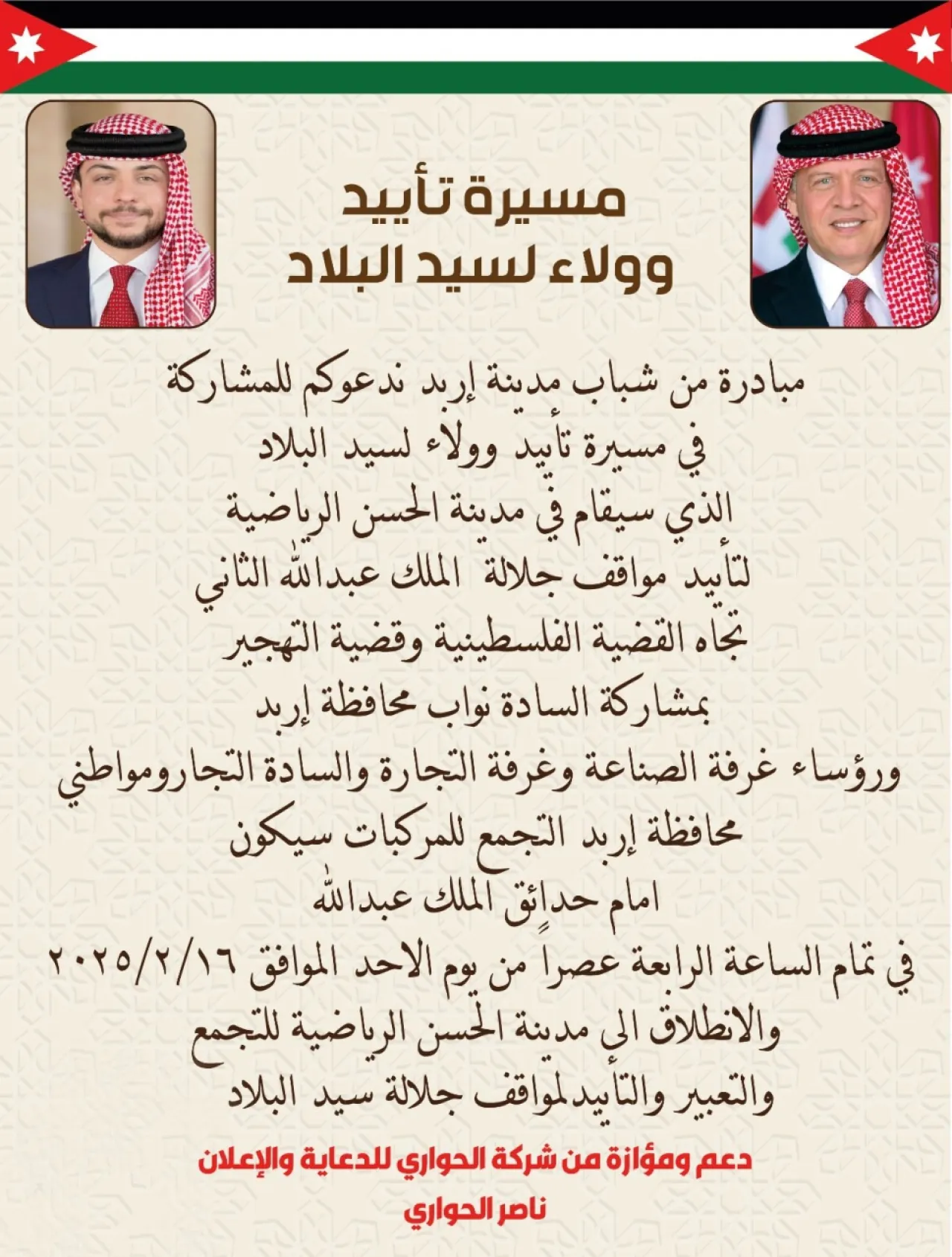 تأتي هذه الفعالية بدعم ومؤازرة من شركة الحواري للدعاية والإعلان، ممثلةً بناصر الحواري، لتجسد روح الوحدة والتلاحم بين أبناء الشعب الأردني وقيادتهم الحكيمة.