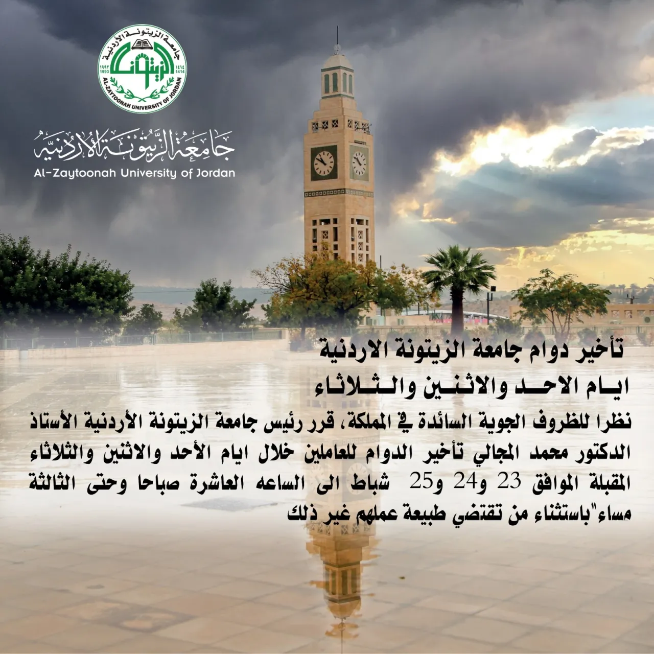 خبرني - نظرا للظروف الجوية السائدة في المملكة، قرر رئيس جامعة الزيتونة الأردنية الأستاذ الدكتور محمد المجالي تأخير الدوام للعاملين خلال ايام الأحد والاثنين والثلاثاء المقبلة الموافق 23 و24 و25  شباط الى الساعه العاشرة صباحا وحتى الثالثة مساء"باستثناء من تقتضي طبيعة عملهم غير ذلك .