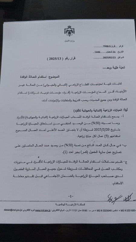 وبحسب القرار، يُسمح لأصحاب الحيازات الزراعية باستقدام العمالة الوافدة بنسبة 50% من الرصيد المتبقي من استحقاقهم بتاريخ 20-02-2025، على ألا يتجاوز الحد الأعلى لعدد العمال المسموح استقدامهم (5) عمال لكل حيازة زراعية.