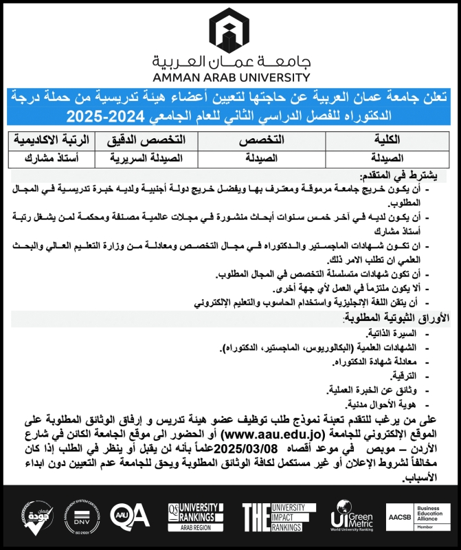 خبرني - تعلن جامعة عمان العربية عن حاجتها للتعيين أعضاء هيئة تدريس من حملة درجة الدكتوراه للفصل الدراسي الثاني للعام الجامعي 2024/2025