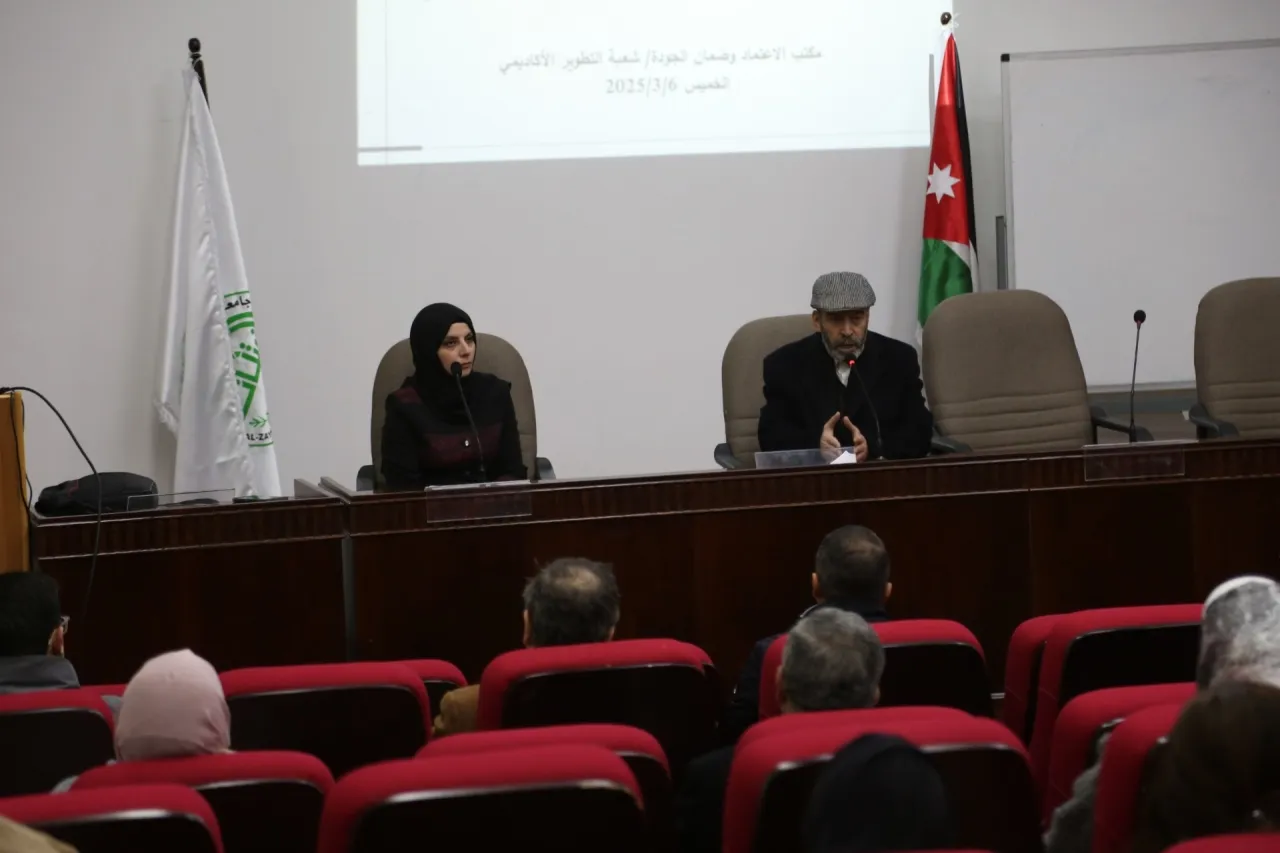 من جانبها، تناولت المهندسة أمل قاصد أحمد، نائب مدير المكتب ورئيس شعبة التطوير الأكاديمي، المحاور الرئيسية التي شملت معايير الاعتماد، المراحل اللازمة للحصول عليه، ومتطلبات كل مرحلة، بالإضافة إلى الأدلة والوثائق الداعمة. كما تناولت أهمية تقرير التقييم الذاتي والتوجيهات اللازمة لإعداده وفق دليل قياس المؤشرات للاعتماد الأردني والنماذج المعتمدة من قبل هيئة اعتماد مؤسسات التعليم العالي وضمان جودتها.