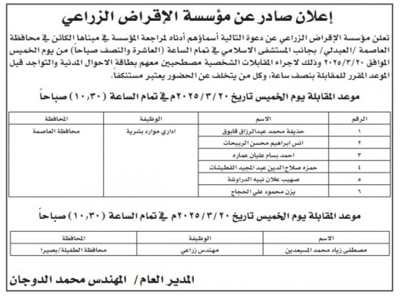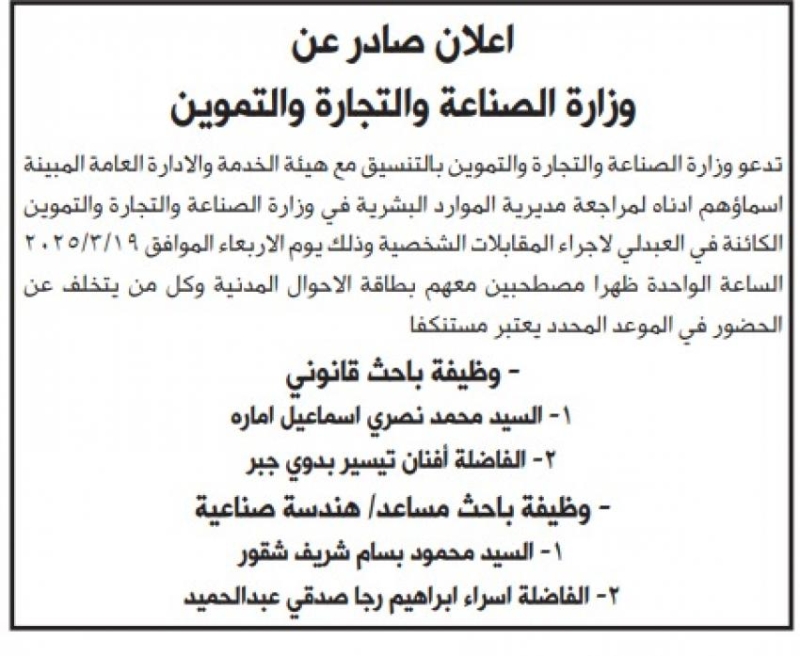 خبرني - دعت مؤسسات حكومية، الأحد، مرشحين لإجراء المقابلات الشخصية لاستكمال إجراءات التعيين، كما أعلنت مؤسسات أخرى عن حاجتها لملء شواغر وظيفية لديها.