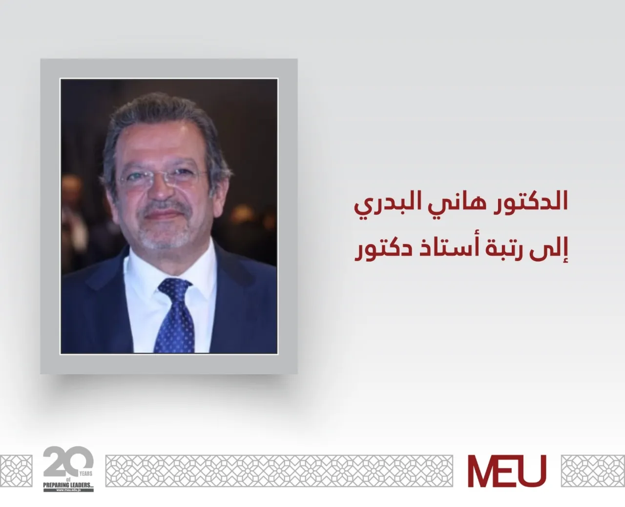 خبرني - قرّر مجلس العمداء في جامعة الشرق الأوسط ترقية الدكتور هاني البدري، عضو هيئة التدريس في كلية الإعلام، إلى رتبة أستاذ في الإعلام.