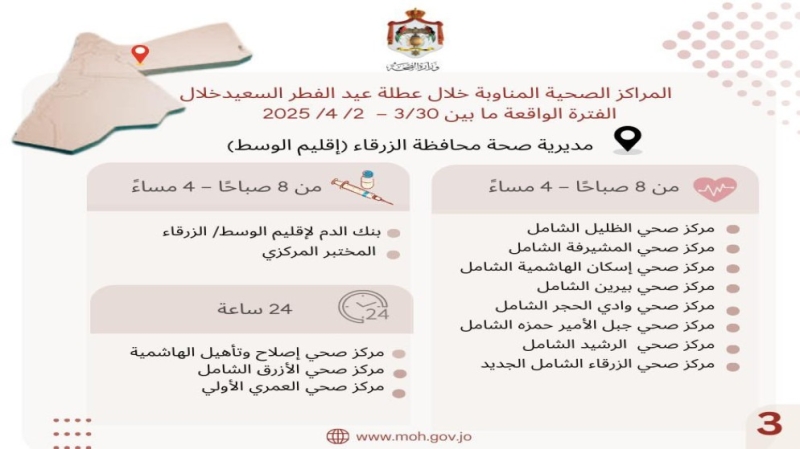 خبرني - أعلنت وزارة الصحة، السبت، أسماء 117 مركزا صحيا من مراكزها في المحافظات كافة للمناوبة خلال فترة عطلة عيد الفطر السعيد.
