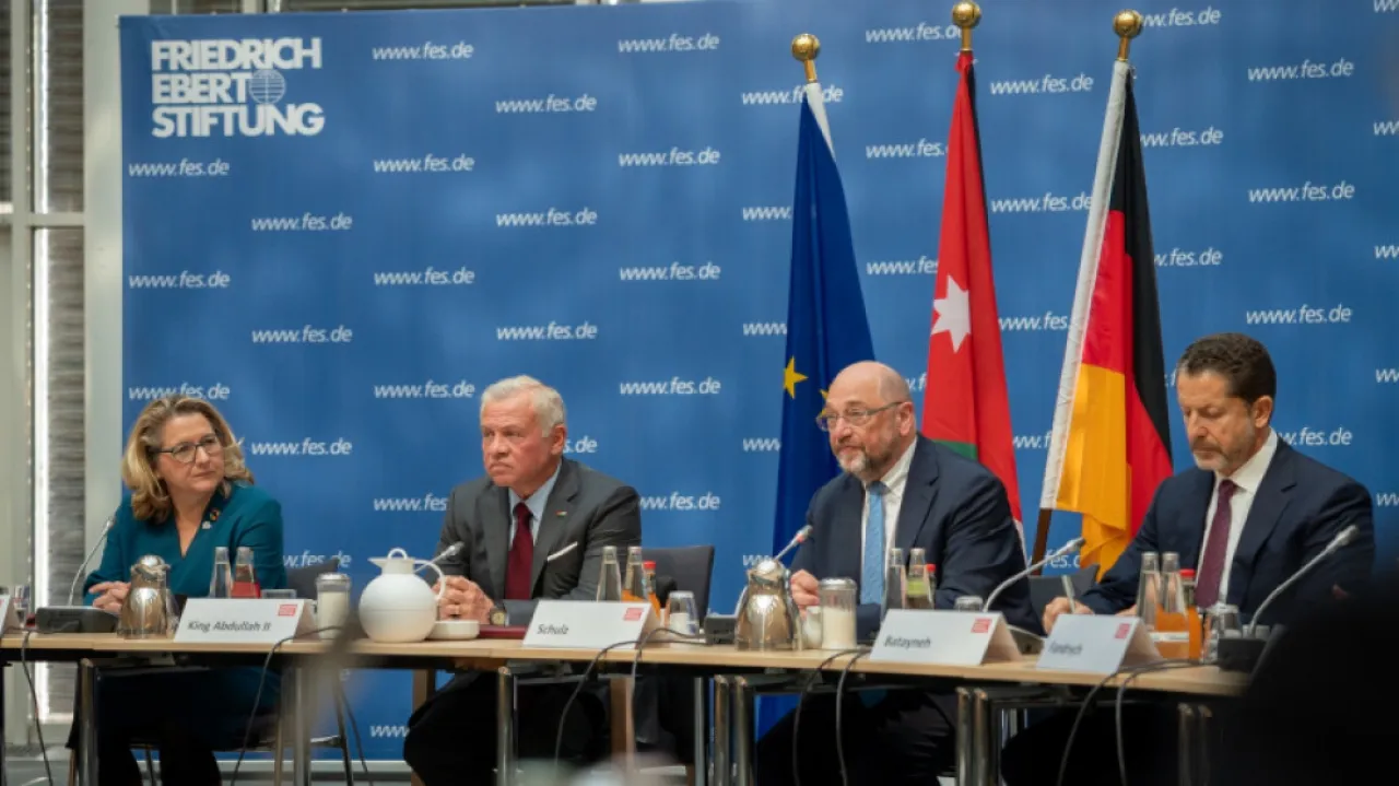 وتحدث جلالته خلال اللقاء، الذي استضافته مؤسسة فريدريش إيبرت الألمانية، عن مجمل التطورات في المنطقة، لا سيما الأوضاع الخطيرة في غزة والضفة الغربية، والتطورات في سوريا ولبنان.