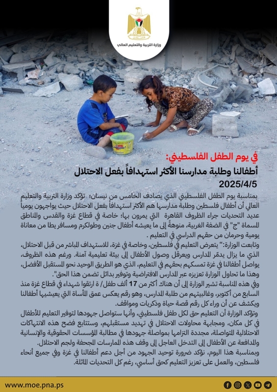 خبرني - ذكرت وزارة التربية والتعليم أن أكثر من 17 ألف طفل وطفلة استشهدوا في قطاع غزة منذ 7 أكتوبر/تشرين الأول 2023.