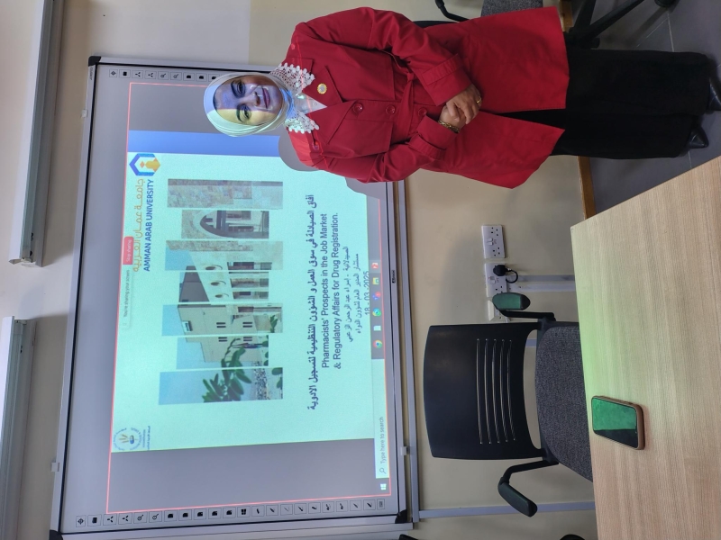 حيث قدمت الورشة الدكتورة الصيدلانية إسراء الزعبي/ مستشار المدير العام لشؤون الدواء في المؤسسة العامة للغذاء والدواء، والخبيرة في مجالات الممارسة الصيدلانية والتنظيمية لأكثر من (20) عاماً، وتطرّقت خلال الورشة إلى الفرص المهنية المتاحة للصيادلة في سوق العمل الأردني، مسلّطةً الضوء على أبرز التحديات التي قد يواجهها الخريجون الجدد، كما ركّزت على الدور الحيوي الذي تطّلع به المؤسسة العامة للغذاء والدواء في تنظيم عمليات تسجيل الأدوية وضمان سلامتها ومأمونيتها، حيث استعرضت الإجراءات التفصيلية اللازمة لتحقيق تسجيل آمن وفعّال للأدوية في السوق المحلي.