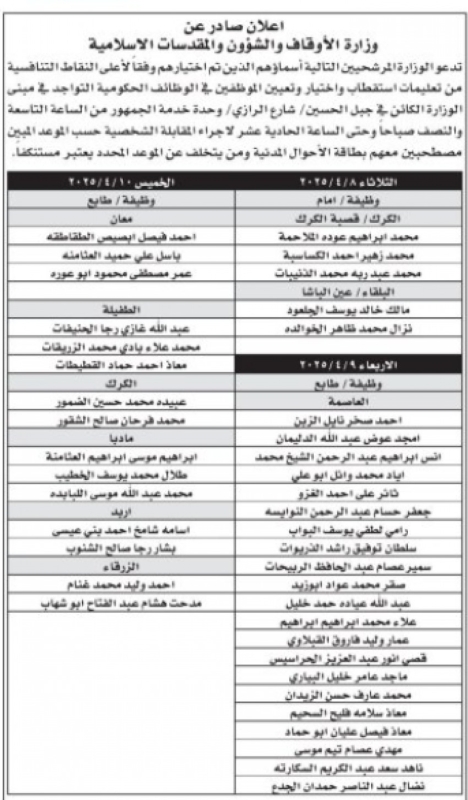 خبرني - دعت المؤسسات الحكومية عددًا من المرشحين لإجراء المقابلات الشخصية، فيما نشرت أخرى، اليوم الأحد، عددًا من الوظائف الشاغرة."