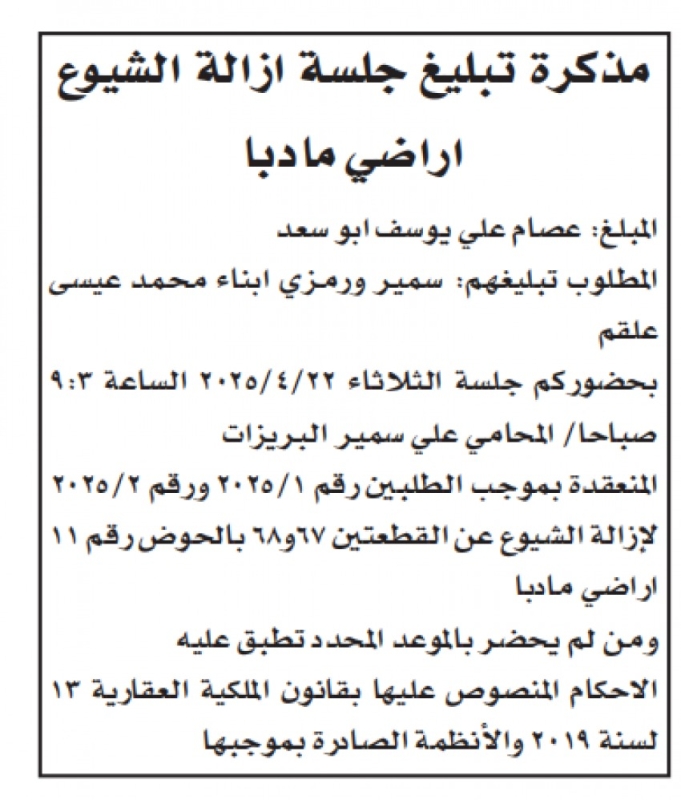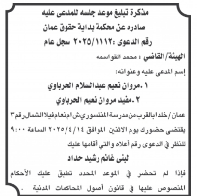 خبرني - صدرت في الصحف المعتمدة رسميًا اليوم الثلاثاء، مذكرات تبيلغ مواعيد جلسات في محاكم لأردنيين.