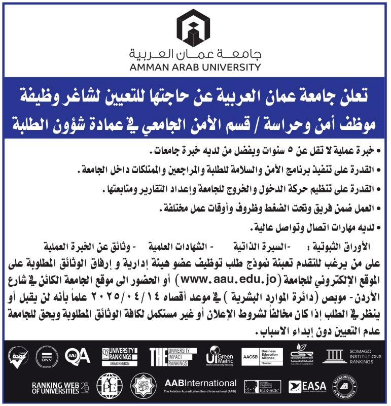 خبرني - تعلن جامعة عمان العربية عن حاجتها للتعيين لشاغر وظيفة “موظف أمن وحراسة / قسم الأمن الجامعي في عمادة شؤون الطلبة”