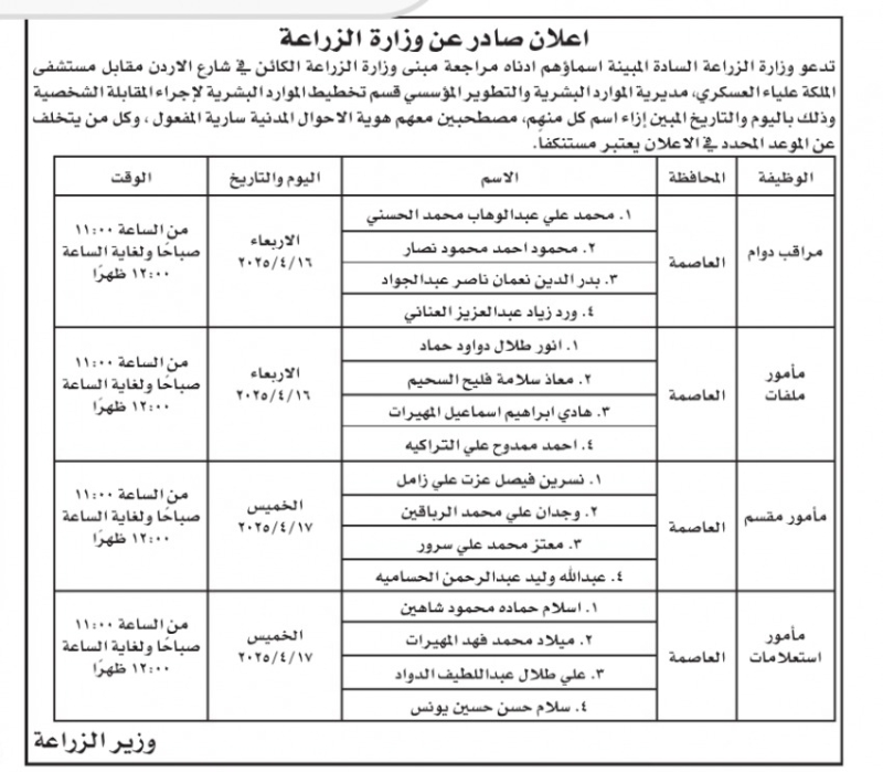 خبرني - دعت وزارة الزراعة وسلطة وادي الأردن مرشحين لإجراء المقابلات الشخصية لغايات التعيين.