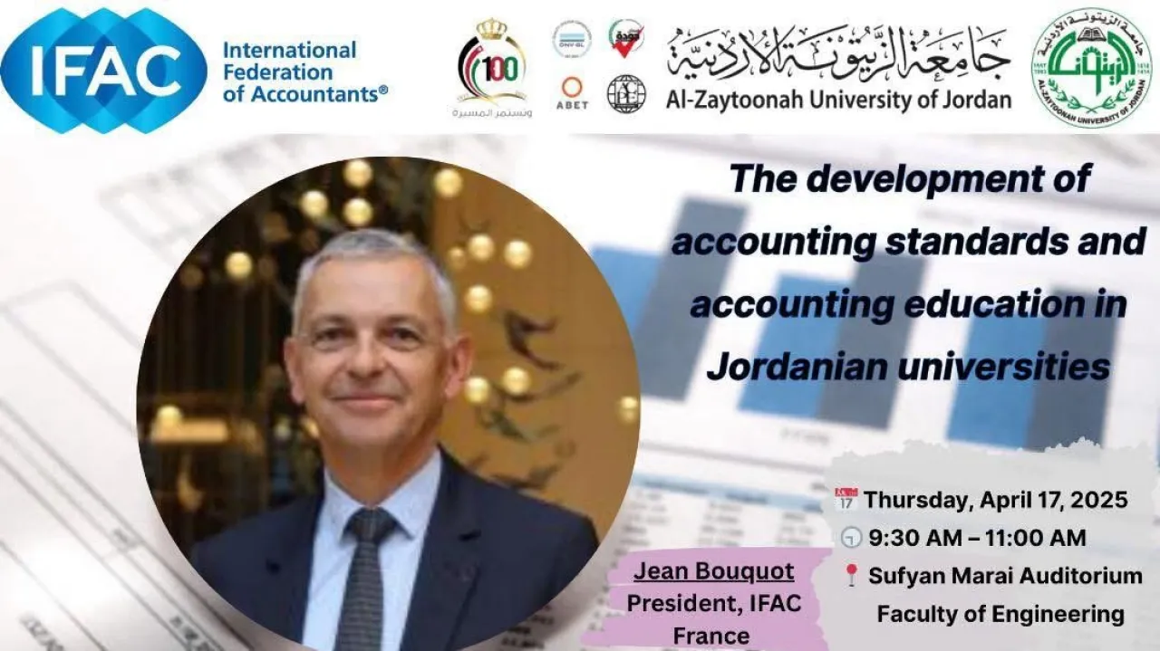 خبرني - تستضيف جامعة الزيتونة الأردنية، بالتعاون مع المجمع الدولي العربي للمحاسبين القانونيين (طلال أبو غزالة العالمية)، حدثًا محاسبيًا أكاديميًا عالميًا، يتمثل في لقاء مفتوح مع رئيس الاتحاد الدولي للمحاسبين القانونيين (IFAC)، الدكتور جون بوكو (Dr. Jean Bouquet)، وذلك يوم الخميس الموافق 17 نيسان 2025 من الساعة 9:30 صباحًا وحتى 11:00 صباحًا في مسرح المهندس سفيان مرعي كلية الهندسة و التكنولوجيا . ويأتي هذا اللقاء لمناقشة سبل تطوير معايير المحاسبة الدولية وآليات تدريسها في الجامعات الأردنية، من خلال إستضافة أعضاء الهيئات التدريسية، والمحاسبين، والمديرين الماليين، والمتخصصين في القطاعات المالية والخدمية والصناعية، إضافة إلى طلبة البكالوريوس والدراسات العليا وكل المهتمين بعالم المحاسبة، في فرصة مميزة للاطلاع على أحدث التوجهات في هذا المجال الحيوي.