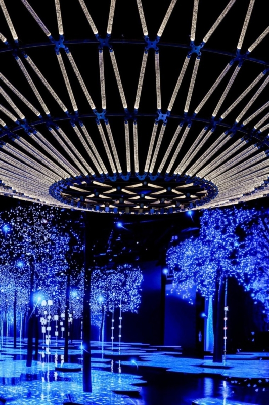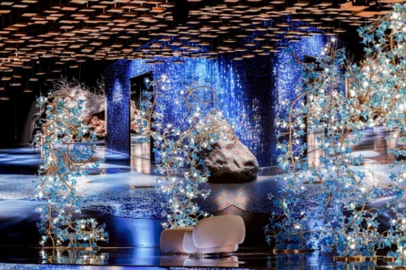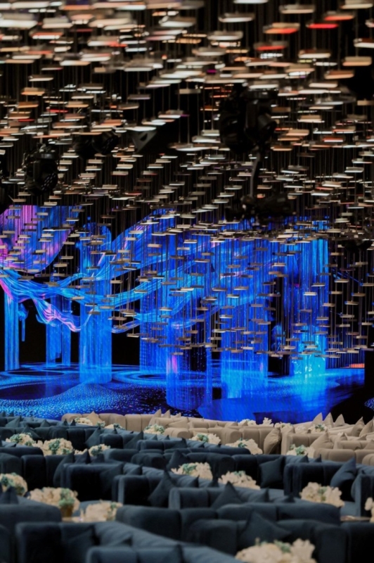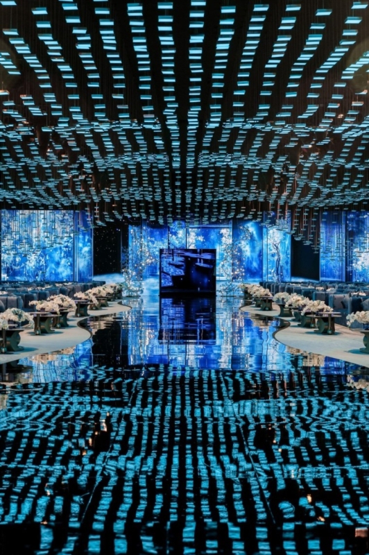 أما الجدران، فازدانت بإضاءات عصرية بألوان الأزرق والبنفسجي، محاكيةً شلالات ضوئية تنساب بين الأعمدة الشفافة، مما أضفى أجواء حالمة على القاعة.