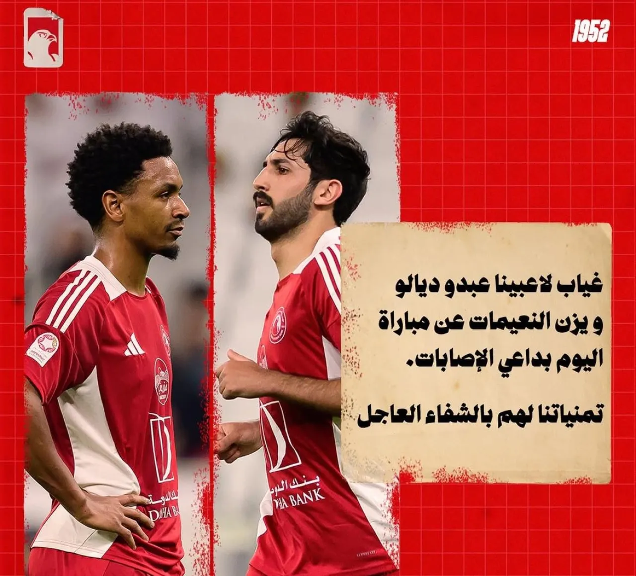 العربي عبّر عن تمنياته بالشفاء العاجل للاعبين، مؤكدًا أهمية عودتهما في أقرب وقت لدعم الفريق في مشواره بالدوري.