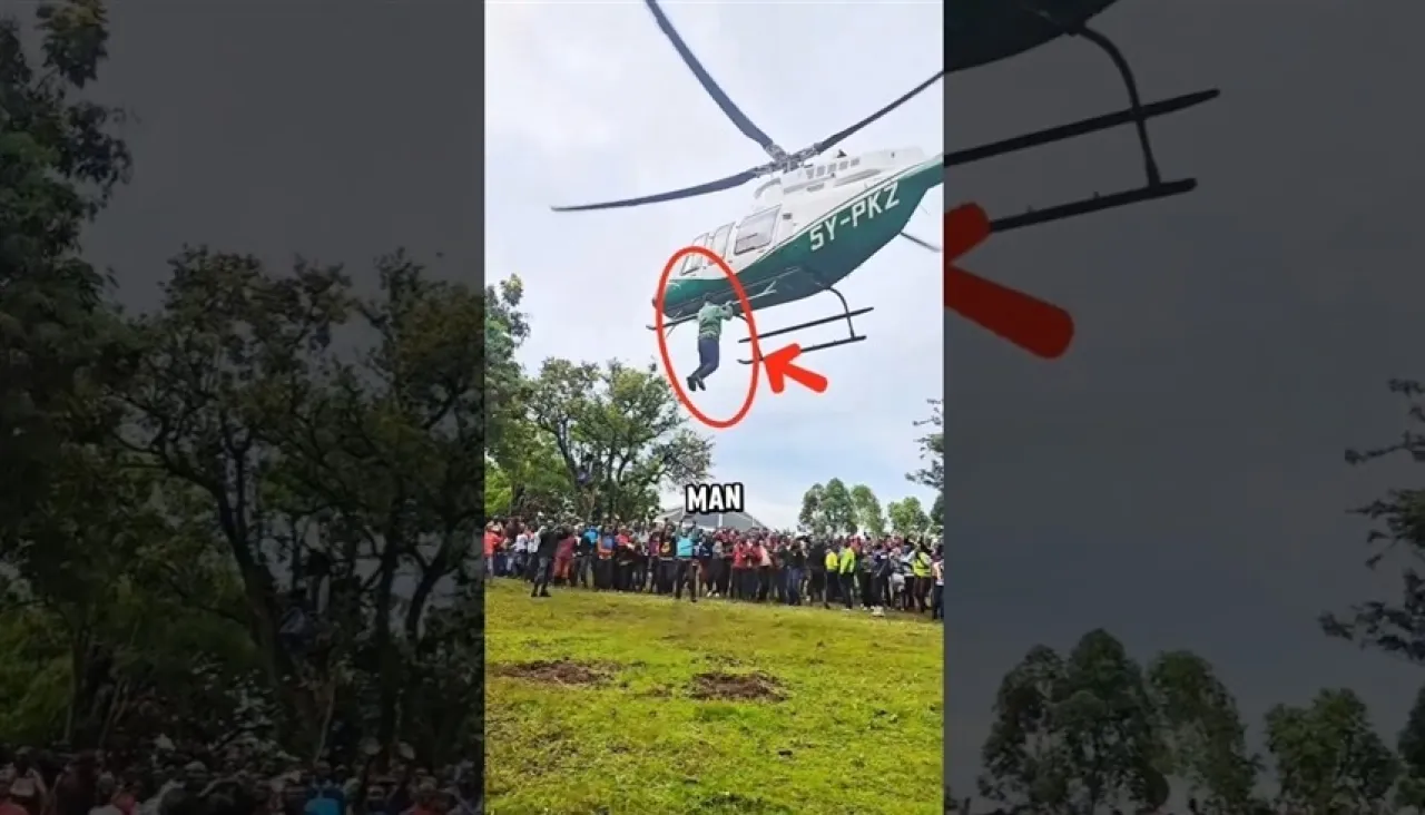 خبرني - تداولت بعض مواقع الإنترنت مقطع فيديو صادم يظهر قيام شاب كيني بالتعلق بمروحية، أثناء إقلاعها خلال حفل زفاف أحد المشاهير، في مشهد شبيه بأفلام الأكشن.