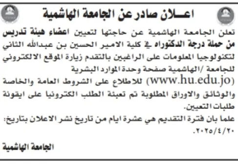 كما أشارت إلى أنه استنادًا لأحكام المادة(19) من نظام إدارة الموارد البشرية في القطاع العام رقم(33) لسنة 2024 وتعديلاته يشترط فيمن يعين في أي وظيفة: أن يكون المتقدم أردني الجنسية، وأن يكون كامل الأهلية، وأن يكون سالمًا من الأمراض التي تمنعه من القيام بأعمال الوظيفة التي سيعين فيها بموجب قرار من المرجع الطبي المختص، وأن يكون غير محكوم بجناية أو جنحة مخلفة بالشرف أو الأمانة أو الأخلاق أو الآداب العامة، وألا يكون شريكًا في شركة تضامن أو مشاركًا في إدارة أي شركة أو مالكًا لمؤسسة فردية أو مكتسبًا صفة التاجر وفق أحكام قانون التجارة، وأن يكون مستوفيًا لمتطلبات إشغال الوظيفة الشاغرة وشروطها وكفاياتها الوظيفية.