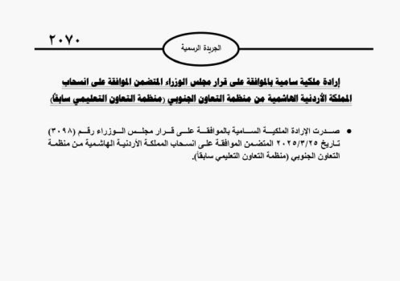 خبرني - صدرت الإرادة الملكية بالموافقة على قرار مجلس الوزراء رقم (۳۰۹۸) تاريخ ٢٠٢٥/٣/٢٥ المتضمن الموافقة على انسحاب المملكة الأردنية الهاشمية من منظمة التعاون الجنوبي "منظمة التعاون التعليمي سابقا".
