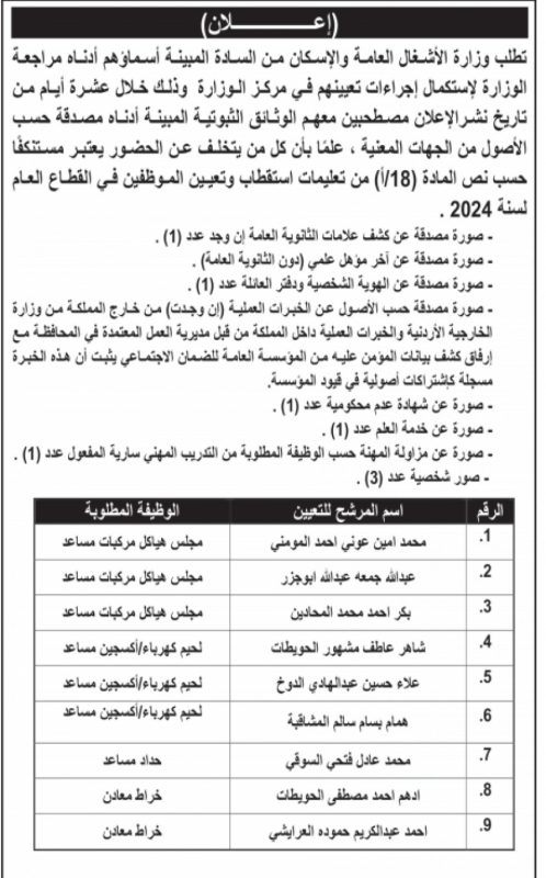 خبرني - دعت وزارة الأشغال العامة والإسكان عددًا من الأردنيين لاستكمال إجراءات تعيينهم.