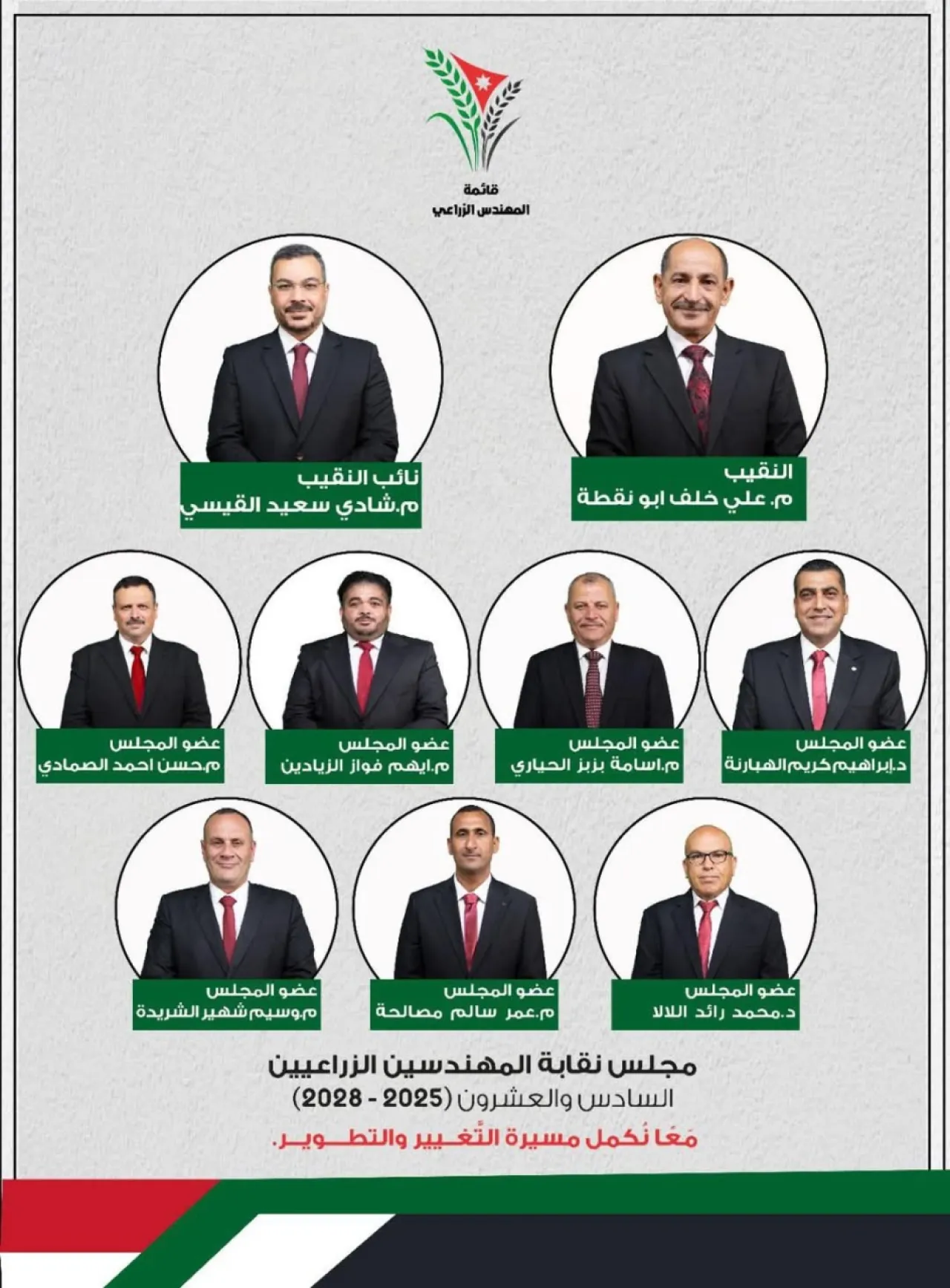 خبرني - أعلنت اللجنة المشرفة على انتخابات مجلس نقابة المهندسين الزراعيين، اليوم، فوز قائمة “المهندس الزراعي” برئاسة المهندس علي خلف إبراهيم أبو نقطة، بجميع مقاعد المجلس للدورة السادسة والعشرين (2025 – 2028)، وذلك بالتزكية وللمرة الأولى في تاريخ النقابة.