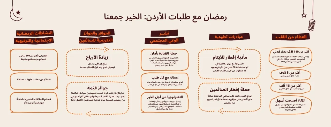 وفي سياق متصل، فقد نظمت "طلبات" الأردن فعاليات تطوعية متعددة بشكل منفرد وأخرى من خلال شراكاتها المجتمعية؛ وذلك لتحقيق أهداف إنسانية واجتماعية عكست معها التزامها بتعزيز قيم التكافل وروح المبادرة لخدمة الآخرين، إلى جانب رفع مستوى السلامة المرورية التي تشكل أهمية قصوى لديها.