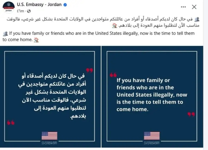 خبرني - دعت السفارة الأمريكية في الأردن المواطنين الأردنيين إلى التواصل مع أفراد عائلاتهم أو أصدقائهم المقيمين في الولايات المتحدة بشكل غير قانوني، وحثهم على العودة إلى بلادهم، معتبرة أن "الوقت مناسب الآن" لاتخاذ هذه الخطوة.