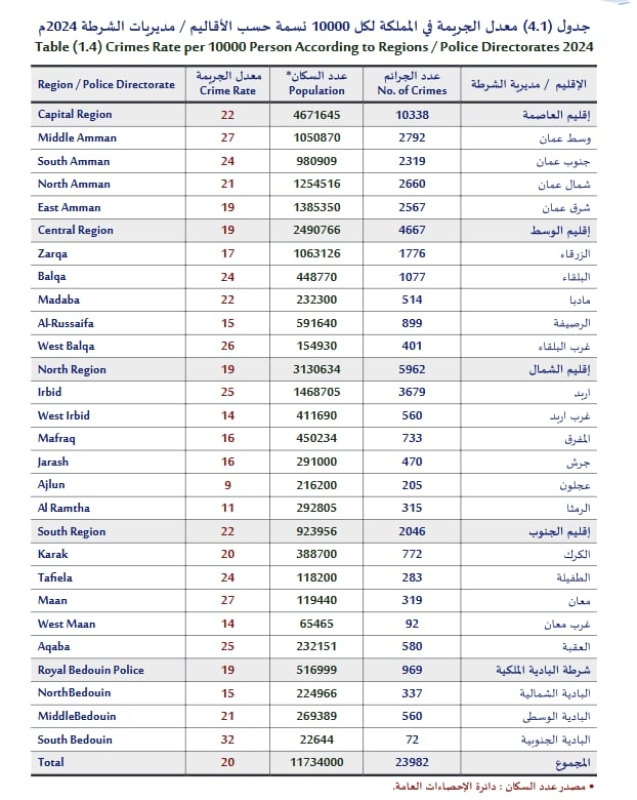 وبلغ عدد الجرائم الكلي في الأردن لعام 2024 نحو 23,982 جريمة توزعت على مختلف مديريات الشرطة، مع تسجيل أعلى عدد في إقليم العاصمة بـ 10,338 جريمة، يليه إربد والزرقاء.