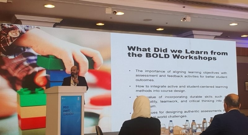 خبرني - شاركت جامعة البترا في احتفال توزيع جوائز فعاليات برنامج "بـولد" "BOLD" والذي عقد بعنوان الاحتفاء والتميز، ومثل جامعة البترا كل من رئيس قسم المحاسبة في كلية العلوم الإدارية والمالية الدكتور عبد الرحمن، ومدير وحدة ضمان الجودة والتخطيط وإدارة الأداء الدكتور أحمد القاسم، وبحضور نائب رئيس الجامعة الدكتور مياس الريماوي.