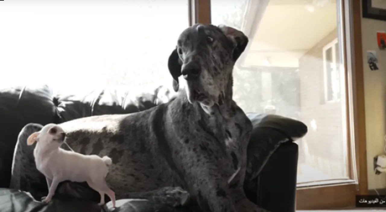وعلى الرغم من فارق الطول بين الكلب الأطول والأصغر في العالم والذي يبلغ 91.56 سنتيمتر (3 أقدام)، فقد لعبا معاً بسعادة عندما التقيا لأول مرة.