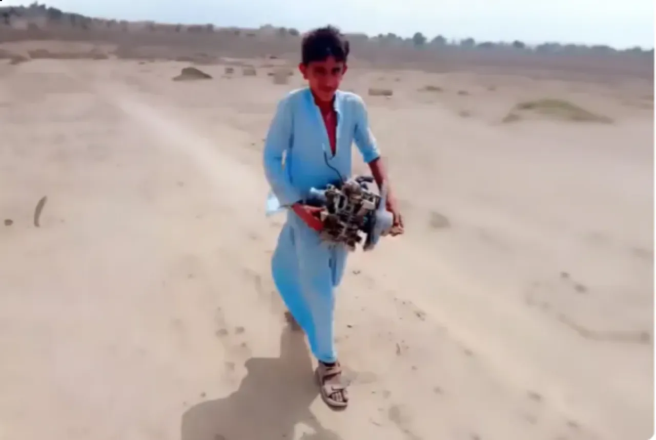في أحد المقاطع اللافتة التي انتشرت على نطاق واسع، يظهر طفل يحمل جزءًا من طائرة مسيّرة من طراز "هاروب" (Harop)، وهي طائرة هجومية انتحارية تُعرف بدقتها العالية في ضرب الأهداف. ويبدو الطفل في الفيديو كأنه يستعد لبيع هذا الجزء ضمن سوق شعبي.
