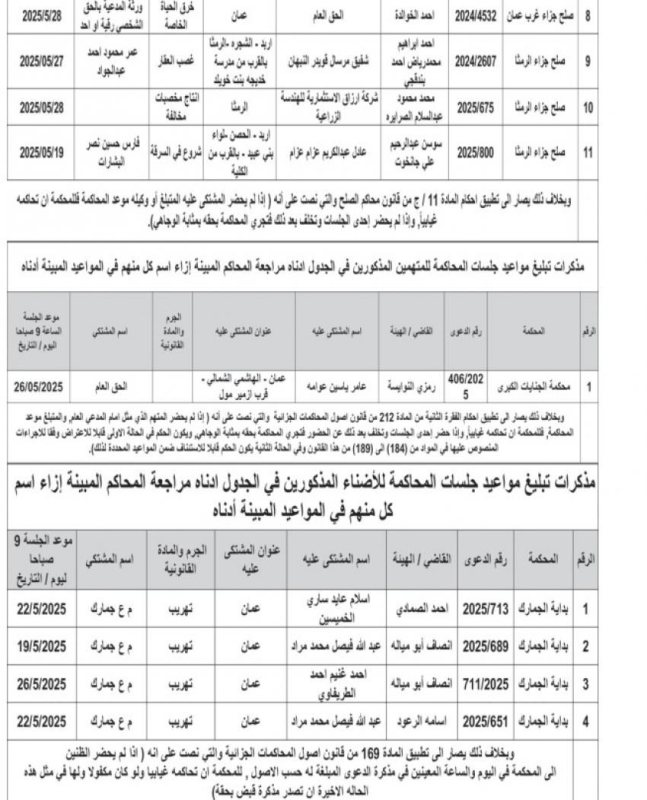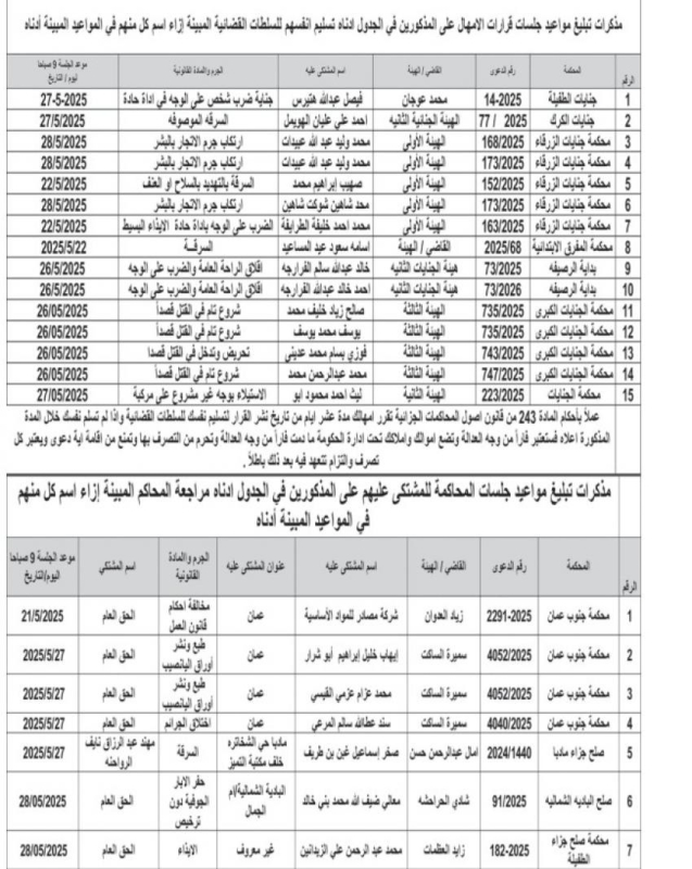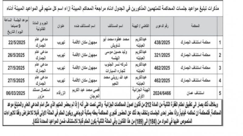 الأردن إصدار مذكرات تبليغ وقرارات إمهال لحضور جلسات محاكمة