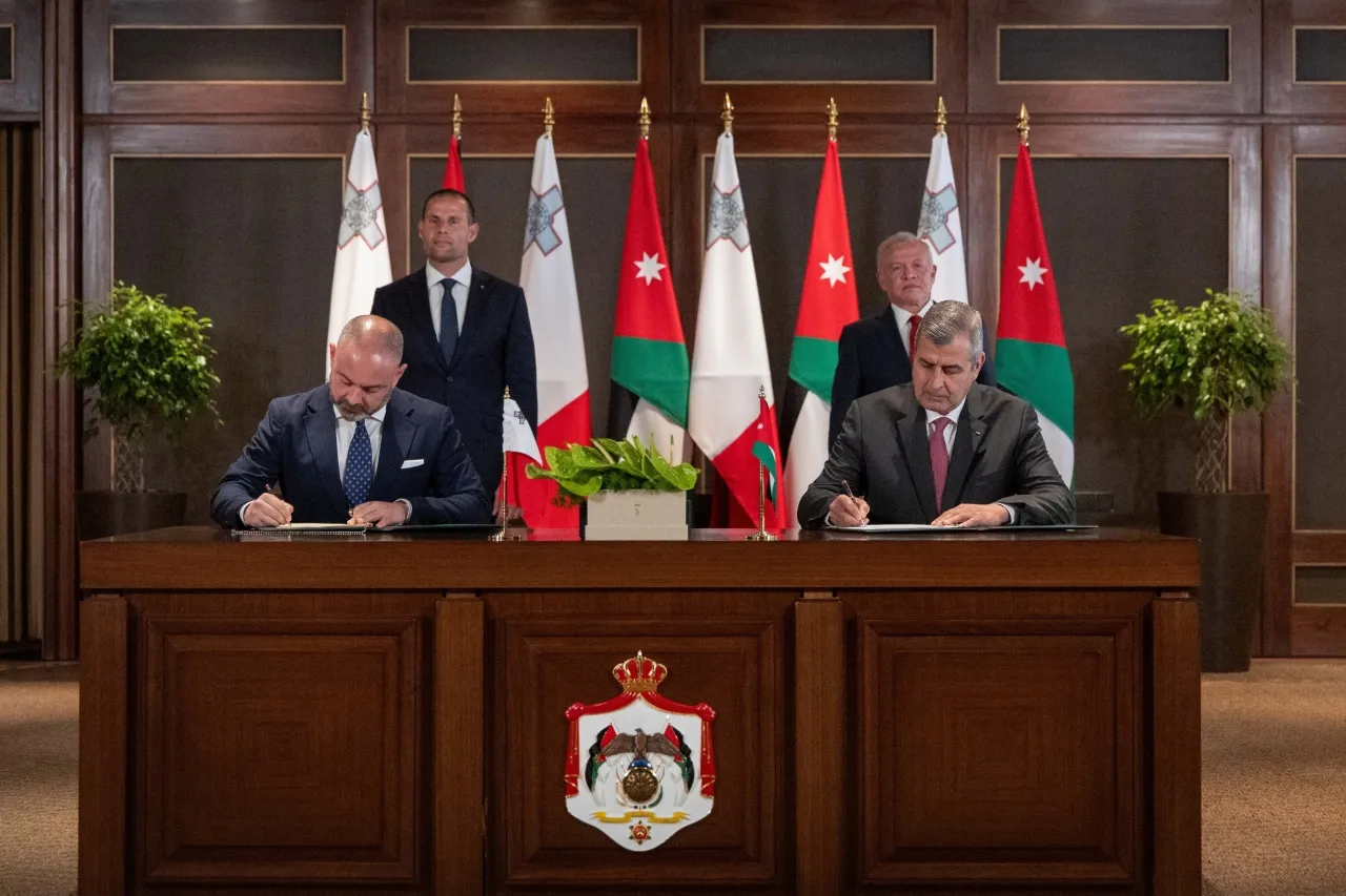 خبرني - شهد الملك عبدالله الثاني ورئيس وزراء مالطا روبرت أبيلا ، مساء الاثنين ، توقيع اتفاقية إطارية للتعاون بين البلدين، وثلاث مذكرات تفاهم في مجالات المياه والطاقة، والسياحة، والأرشفة وتبادل اللغات.