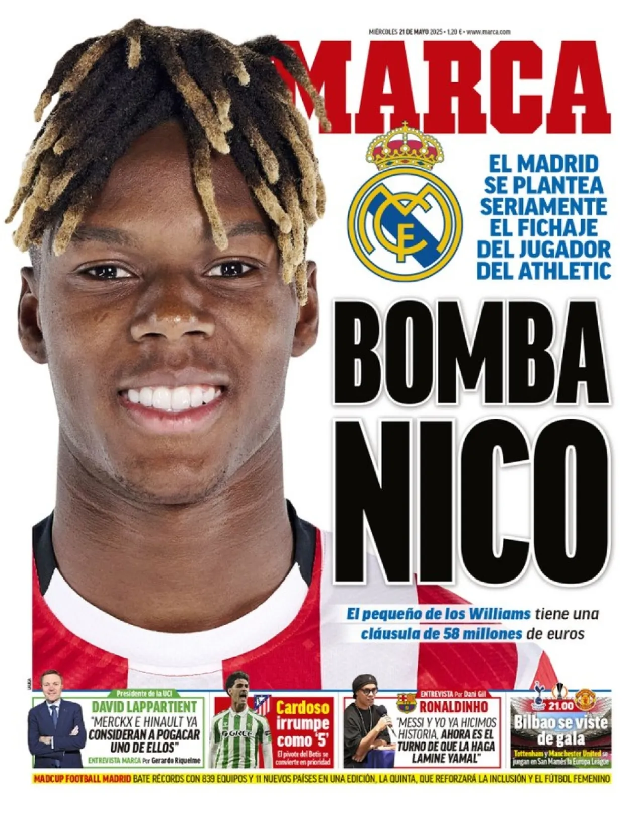 ذكرت الصحيفة أن "الملكي" سيزاحم برشلونة على ضم النجم نيكو ويليامز من أتلتيك بلباو.