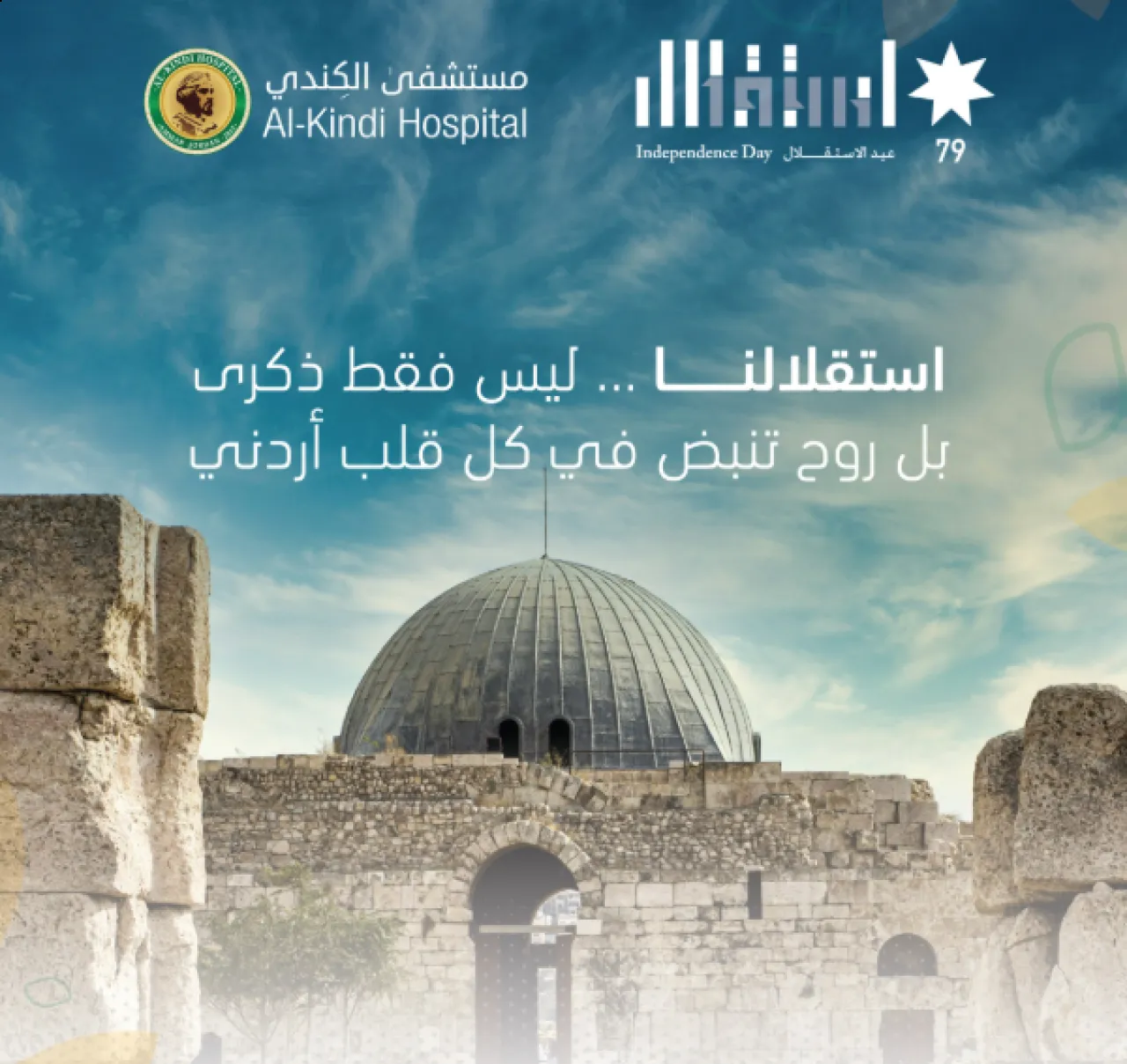 Khaberni -Dr. Mohammad Khrees, Chairman of the Board of Directors at Al Kindi Hospital, and the hospital staff extend their sincerest congratulations and blessings to His Majesty King Abdullah II and his beloved Crown Prince, His Highness Prince Hussein bin Abdullah II, on the occasion of the seventy-ninth Independence Day of the Hashemite Kingdom of Jordan.