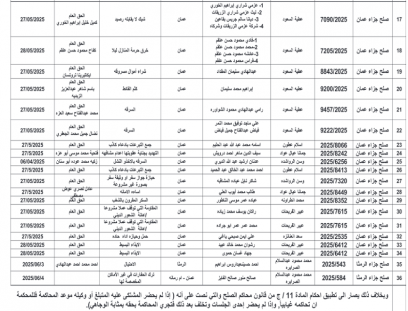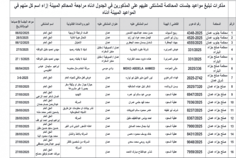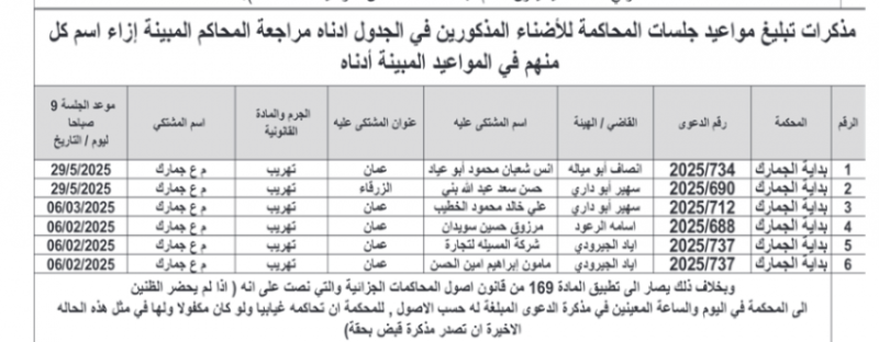 خبرني - خبرني - صدرت الثلاثاء، مذكرات تبليغ مواعيد جلسات محاكمات لمشتكى عليهم بتهم مختلفة وقرارات إمهال لحضور جلسات محاكمة.