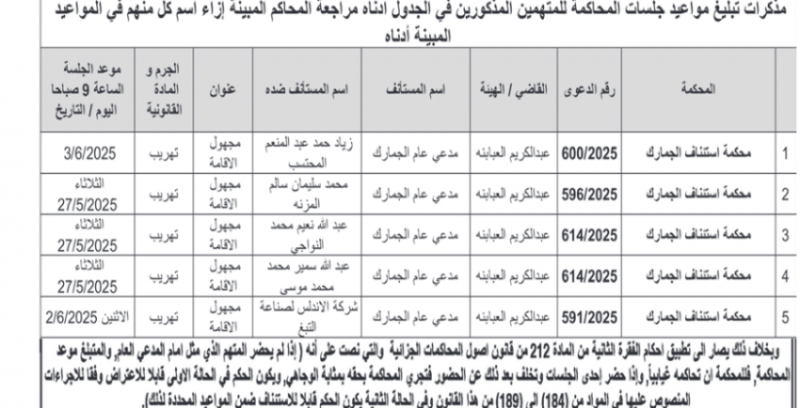 وطلبت المذكرات من المذكورين في الجداول أدناه مراجعة المحاكم المبينة ازاء اسم كل منهم في المواعيد المبينة أدناه.