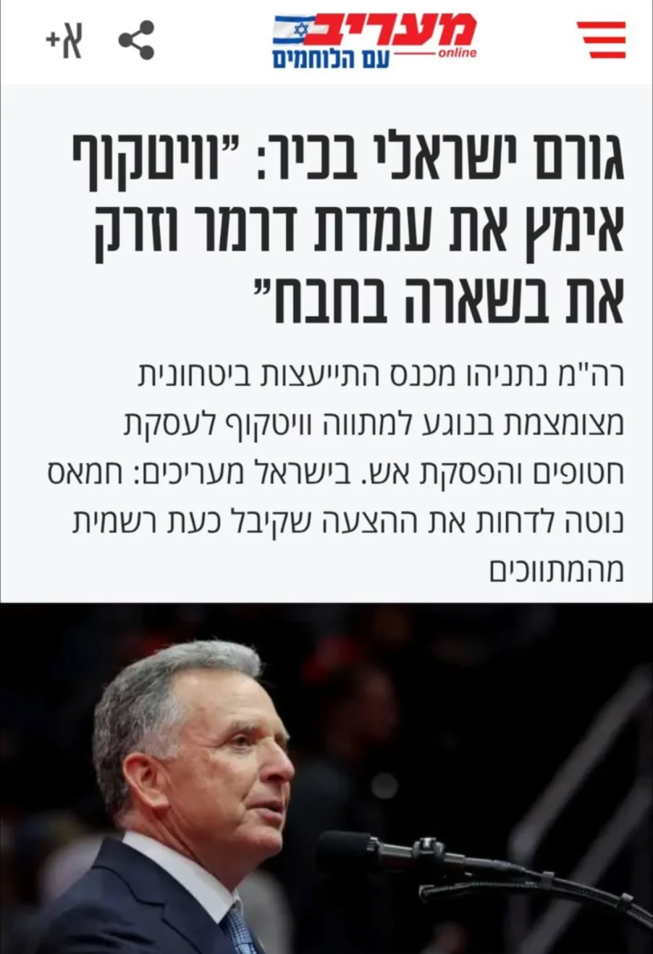 خبرني - كشفت صحيفة معاريف الإسرائيلية عن مصدر إسرائيلي رفيع أن "ويتكوف تبنى مقترح رون دريمر، وتخلى عن بشارة بحبح".