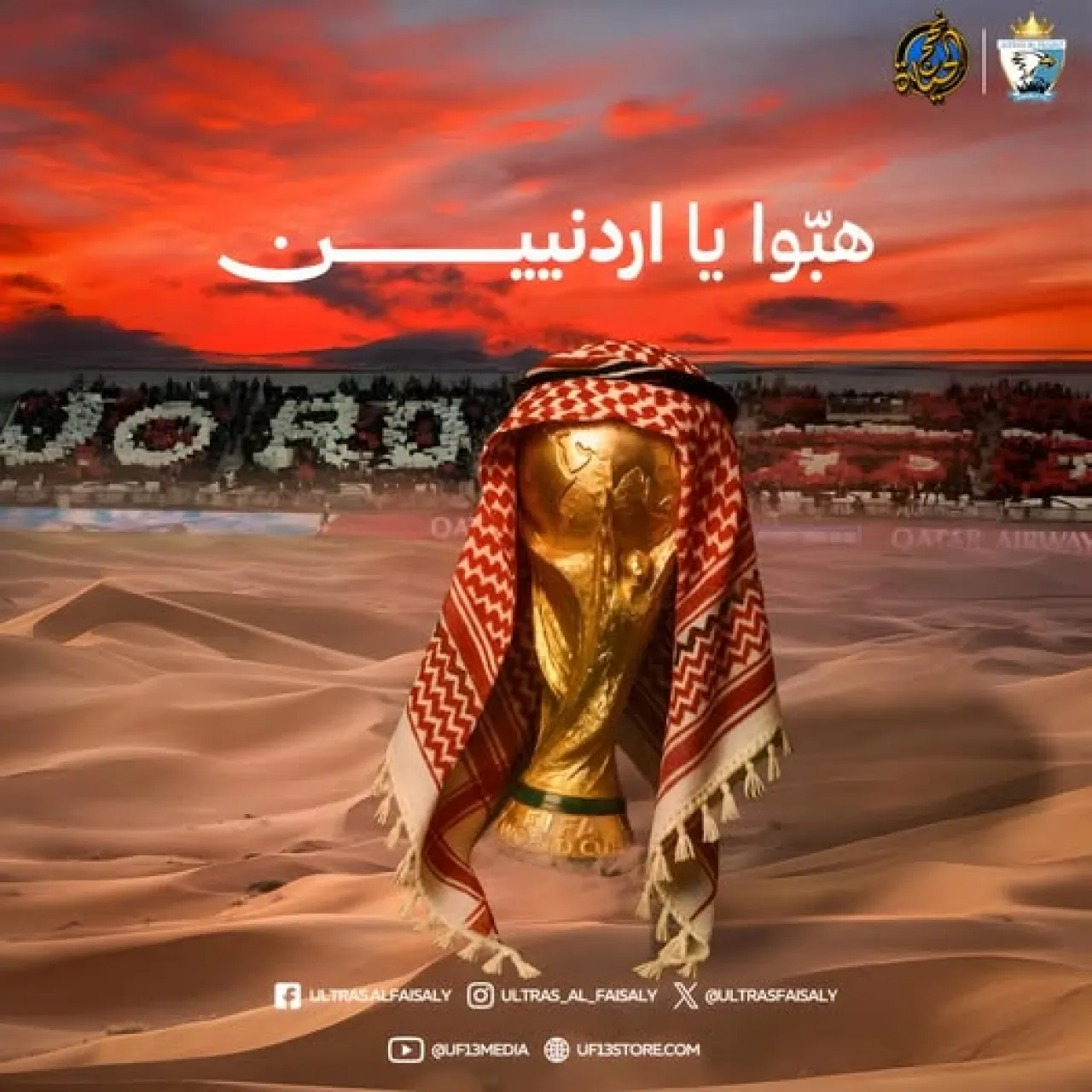 يسُرنا نحنُ التراس الفيصلي ما نراهُ من التفافٍ شعبويّ حوّل منتخبنا الوطنيّ و التماسنا لحقيقة ايمان ابناء وطننا باحقيّة وصولنا لهدفنا الذهبيّ، هذا و ندعوا عموم الأردنيين و ابناء مدرجات نادي الوطن الفيصلي خاصّة الذين أكدوا لنا سابِقاً انهم لا يحتاجون لدعواتِ حضور فوطنيّتهم جعلت منهم قادةً لرياضةِ الوطن و الجمهور، ندعوكم جميعاً لـ اللحاق ببعثة المُنتخب استعداداً لمواجهة المُنتخب العُمانيّ في موّقعتنا القادمة في الخامِس من حزيران المُقبِل و لنجعلها ليلةً رغيدة تُقربنا خطوةً ما قبل أخيرة نحوَ التأهل و العيد الوطنيّ.