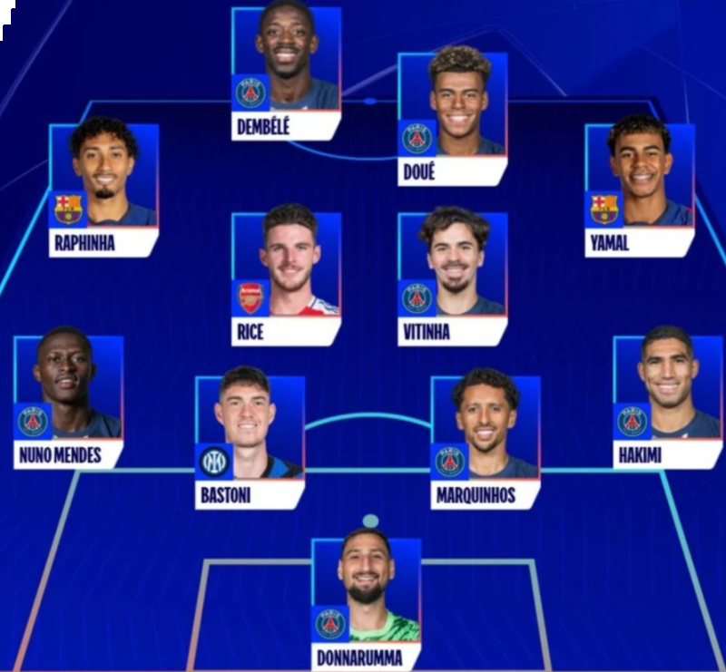 وعرفت التشكيلة النموذجية حضور 7 لاعبين من سان جيرمان، مُقابل لاعبيْن من برشلونة، ولاعب واحد من إنتر وآرسنال.