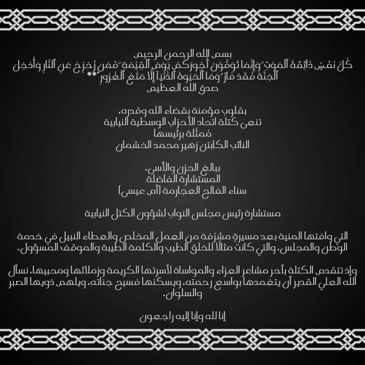 التي وافتها المنية بعد مسيرةٍ مشرّفة من العمل المخلص والعطاء النبيل في خدمة الوطن والمجلس، والتي كانت مثالًا للخلق الطيب والكلمة الطيبة والموقف المسؤول.