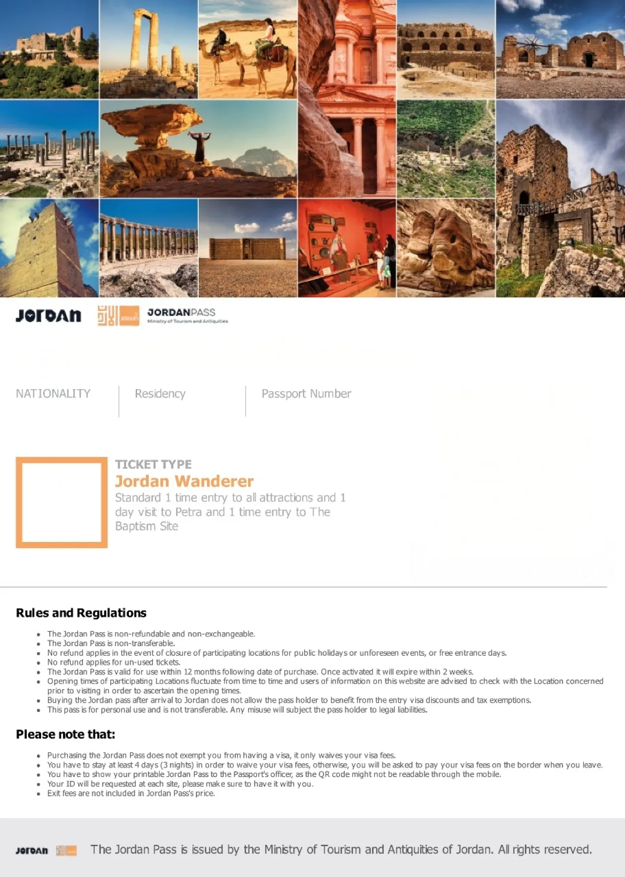 وتبلغ قيمة التذكرة الموحدة 100 دولار، وتمنح حاملها صلاحية دخول 38 موقعًا سياحيًا وأثريًا لمدة تصل إلى 3 أشهر، من ضمنها مدينة البترا، مع إعفائه من رسوم تأشيرة الدخول بشرط الإقامة لثلاث ليالٍ متتالية على الأقل داخل المملكة. كما تُباع التذكرة إلكترونيًا من خلال منصة مخصصة وتطبيقات الهواتف الذكية، ما يسهل على السياح الحصول عليها بسهولة ويسر.