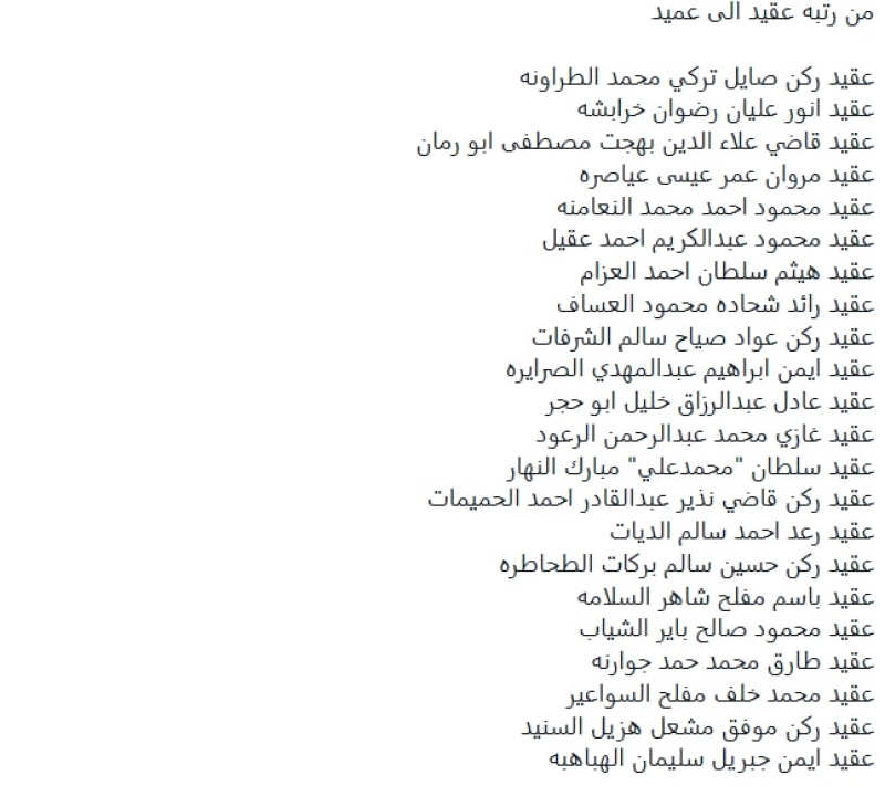 خبرني - صدرت الإرداة الملكية بترفيع عدد من الضباط في مديرية الأمن العام للرتب التي تلي رتبهم الحالية.