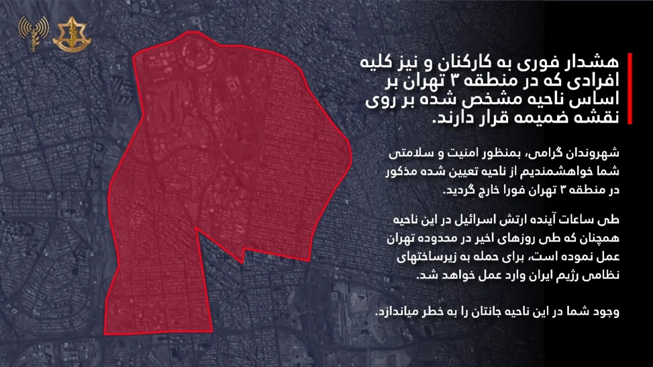 خبرني - نشر الناطق باسم جيش الاحتلال افيخاي ادرعي خارطة وتحذيرا باللغة الفارسية ، يطلب فيها باخلاء مناطق في طهران فورا.