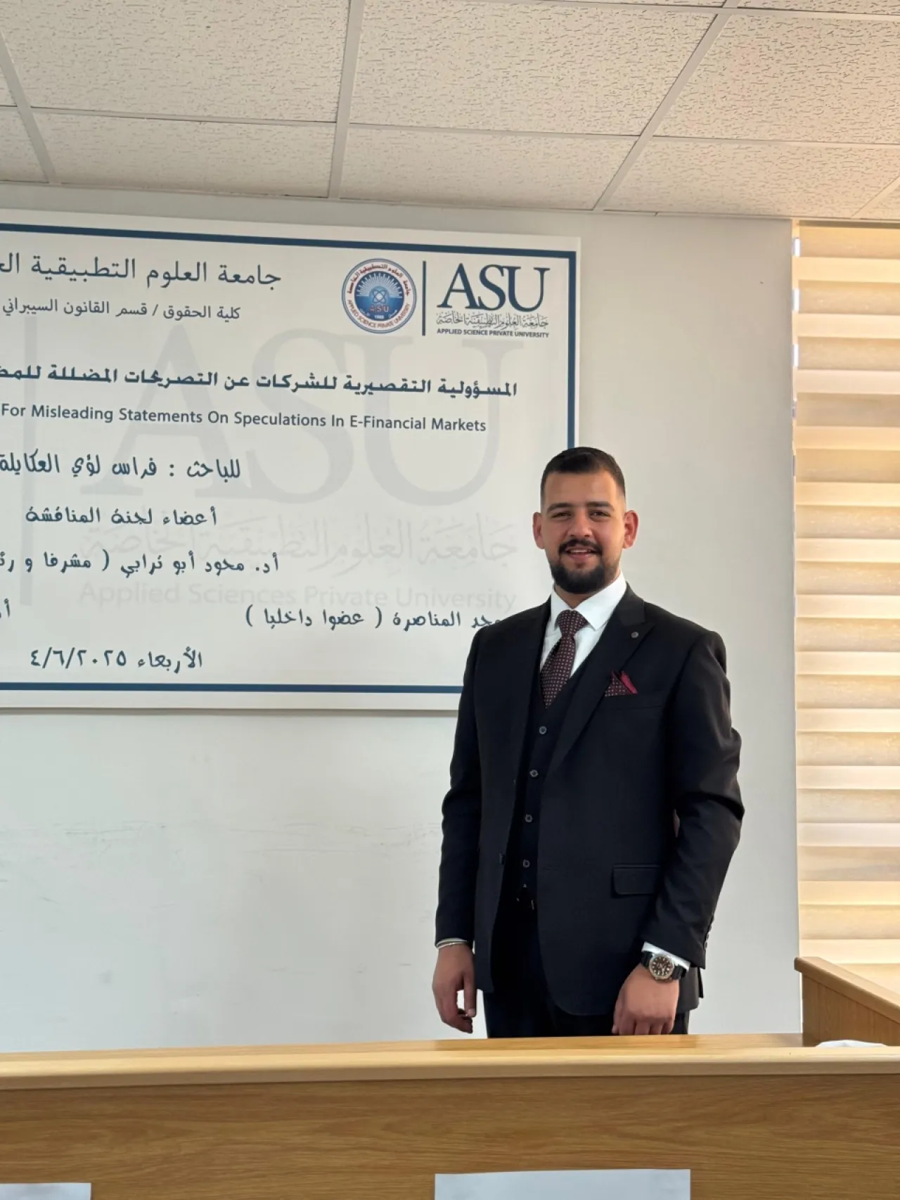 خبرني - يتقدم الأهل والأقارب بأسمى آيات التهنئة والتبريك لابنهم الغالي فراس لؤي العكايلة بمناسبة حصوله على درجة الماجستير في القانون من جامعة العلوم التطبيقية الخاصة.