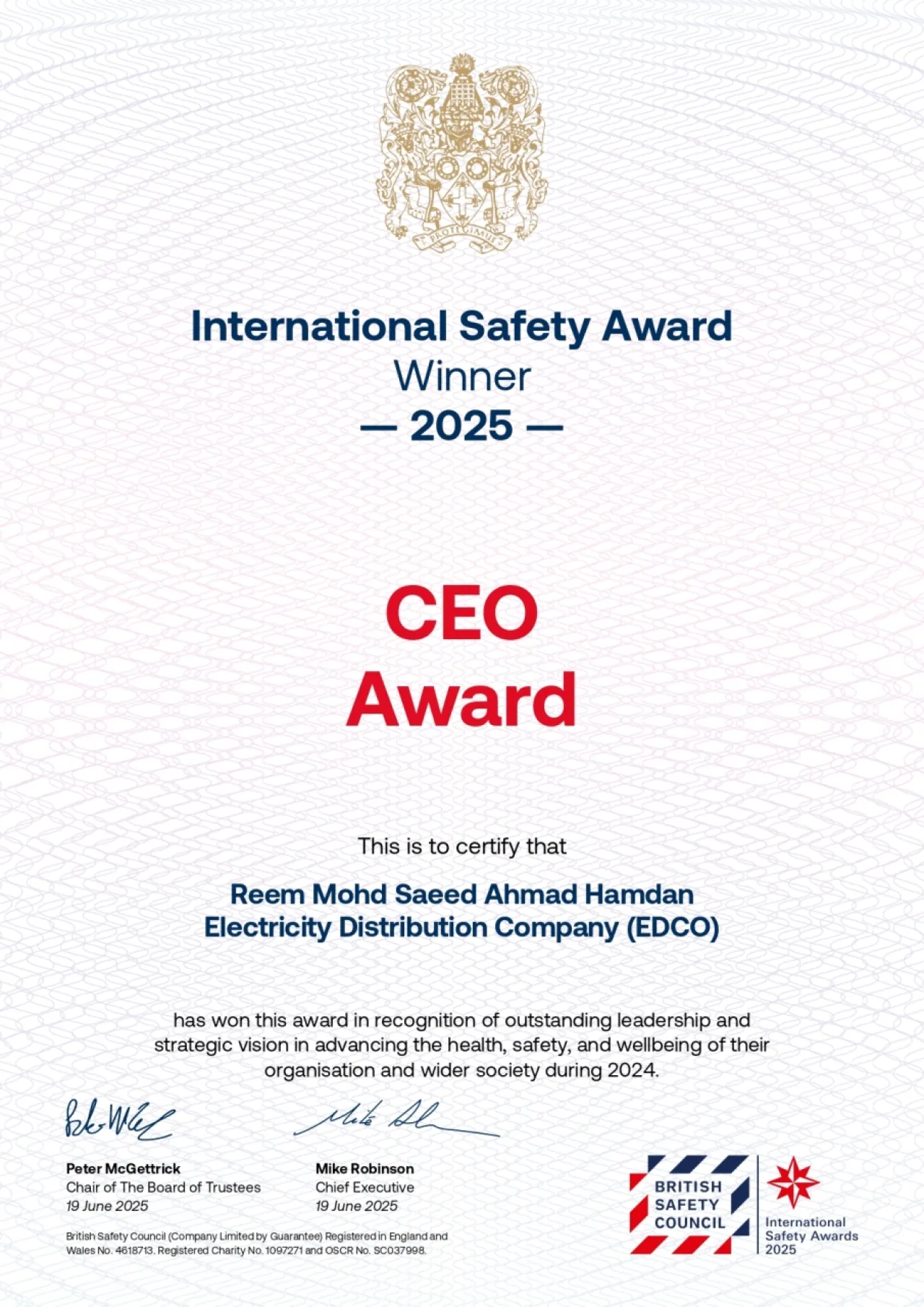 وفي تصريح لها بهذه المناسبة، قالت المديرة العامة لشركة توزيع الكهرباء، المهندسة ريم حمدان، "يشرفني أن أحظى بهذا التقدير الدولي الذي يعكس العمل الجماعي والتزام كوادر الشركة كافة بتحقيق بيئة عمل صحية وآمنة".